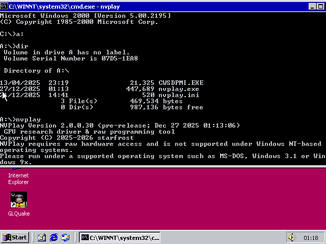 NVplay showing its unsupported screen in VGA mode Windows 2000. Windows NT is not compatible with NVPlay as NTVDM does not allow direct hardware access for good reasons.