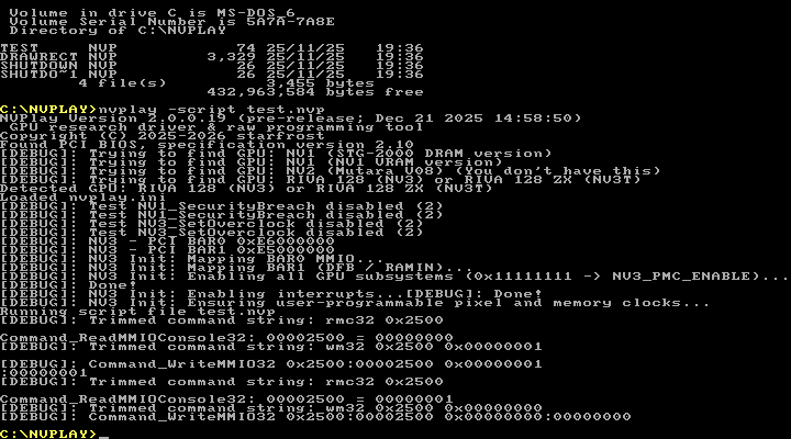 NVPlay is a tool designed to allow low-level communication with and control of graphics hardware, focusing on early Nvidia GPUs from the mid to late 1990s. It is a tool intended for developers to aid emulation efforts. The program will initialise your installed GPU in an entirely freestanding way without any drivers and has several modes that allow different methods to control your graphics hardware.